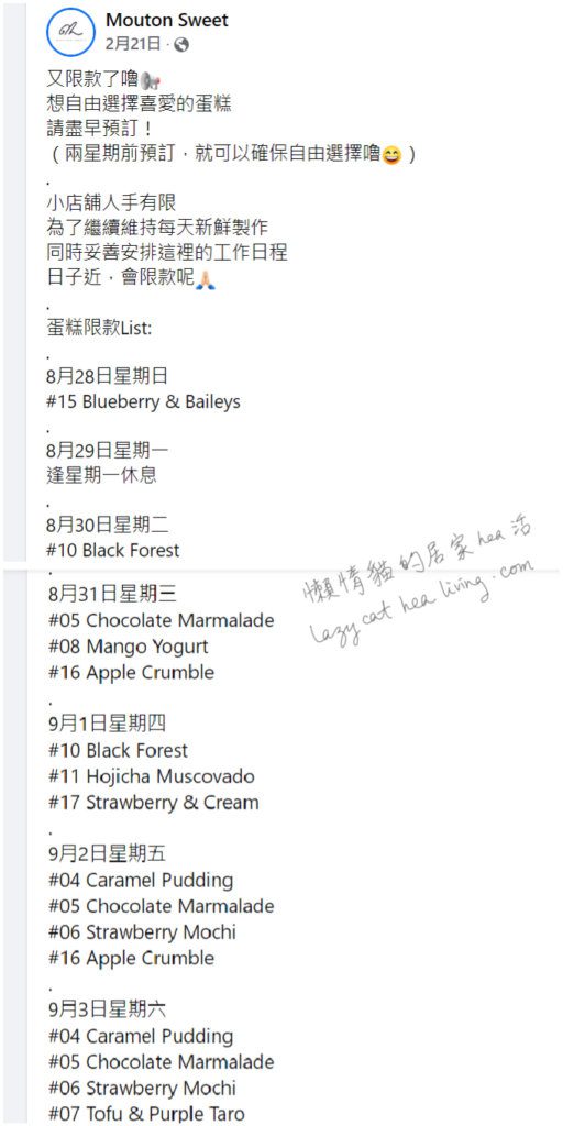(店家facebook 有關蛋糕款式帖子, 在26/8/2022的截圖)
