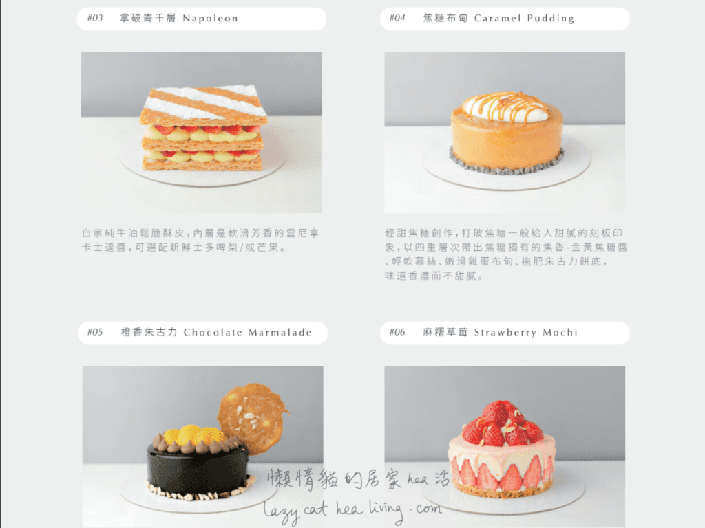 我也是在家人生日前幾天才預訂, 所以當時可以選的款式也只有兩三款, 最後運用消除法, 考慮 「#03 拿破崙千層」和「#06 麻糬草莓」之間應該選哪一款, 看過產品目錄的圖片和簡介, 仍然很糾結。XD