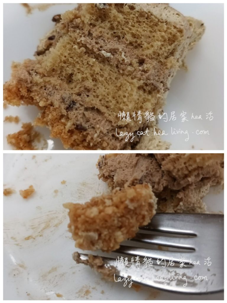 跟上面焦糖布甸蛋糕相反, 它的餅底部份反倒是吃到一點小巧思 — 裡面吃得到椰絲呢!!! 家人超喜歡。